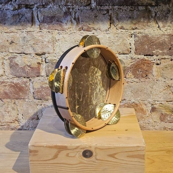 The riq features hand-hammered brass cymbals that produce a clear, bright jingle with smooth decay, complementing the natural resonance of the fish skin.